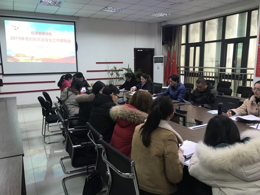 为深入贯彻落实学校党委关于“不忘初心 牢记使命”主题教育工作部署,进一步增强意识形态工作的针对性和实效性,严格落实党管意识形态工作原则。2019年12月19日下午,经济管理学院党总支在奥训楼506会议室举行意识形态及安全工作研讨会。校保卫处朱志刚科长、学院全体专兼职辅导员参加,会议由党总支副书记陶毅主持。会上,邹建华传达了学校党委宣传部关于意识形态工作要求和检查意见,吴俊对学院学期安全工作进行总结,参会人员...